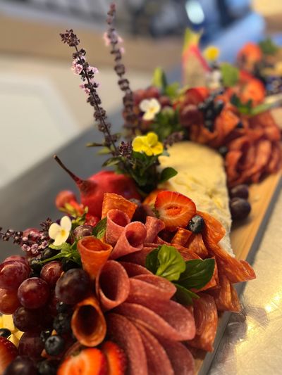 A Fruiterie Board sans meat is a vibrant and bountiful platter filled with an assortment of fresh fruits, nuts, cheeses, and other plant-based delights, creating a colorful and delicious display that caters to a meat-free dining experience.